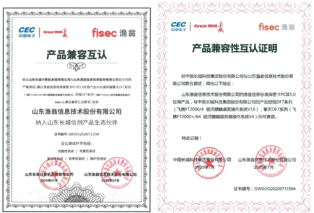 从功能性、可靠性、易用性、效率性、维护性五大环节,evo视讯官网信息与长城进行了严格的联合测试。最终确认evo视讯官网PCI-E 5.0密码卡与长城终端产品——世恒DF7系列(飞腾FT2000/4 银河麒麟桌面操作系统V10),擎天DF7系列(飞腾FT2000+/64 银河麒麟服务器操作系统V4),满足兼容认证要求。并且,evo视讯官网信息此次成为了长城信创产品生态伙伴,携手构建安全新生态。